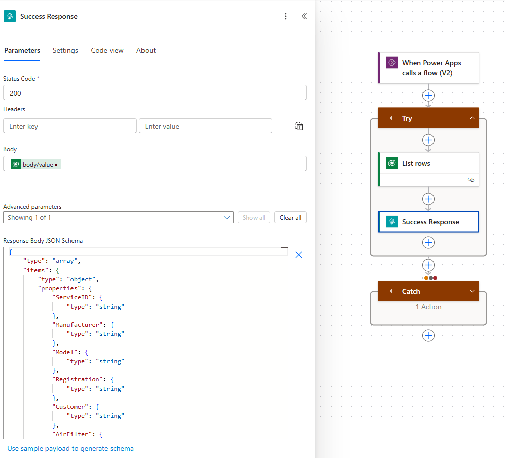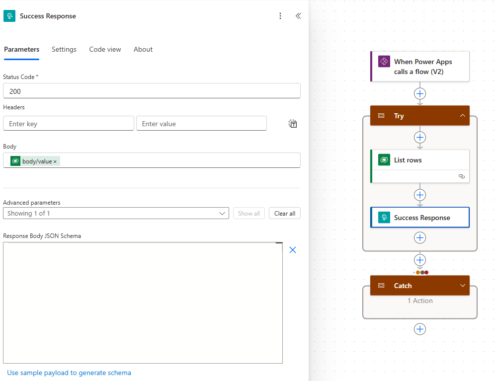 Go back to our Power Automate flow and select the Success Response action and fill in as follows: