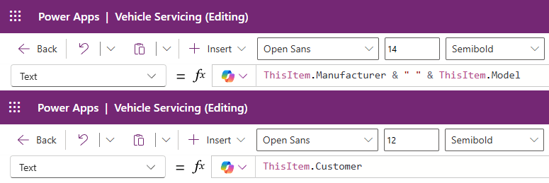 Now we need to set the text on the Gallery item labels to match the field names returned by our flow: