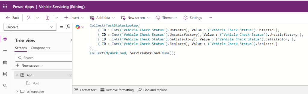 Next, we want to call this flow when the app starts. Select the App from the component window, and update the OnStart property by appending: