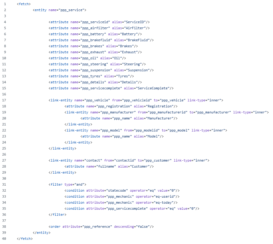 Rather than have five separate queries (one for each table), we use Fetch XML to join all tables we need. Note the use of the following operators: