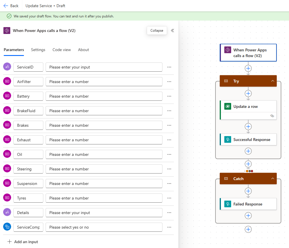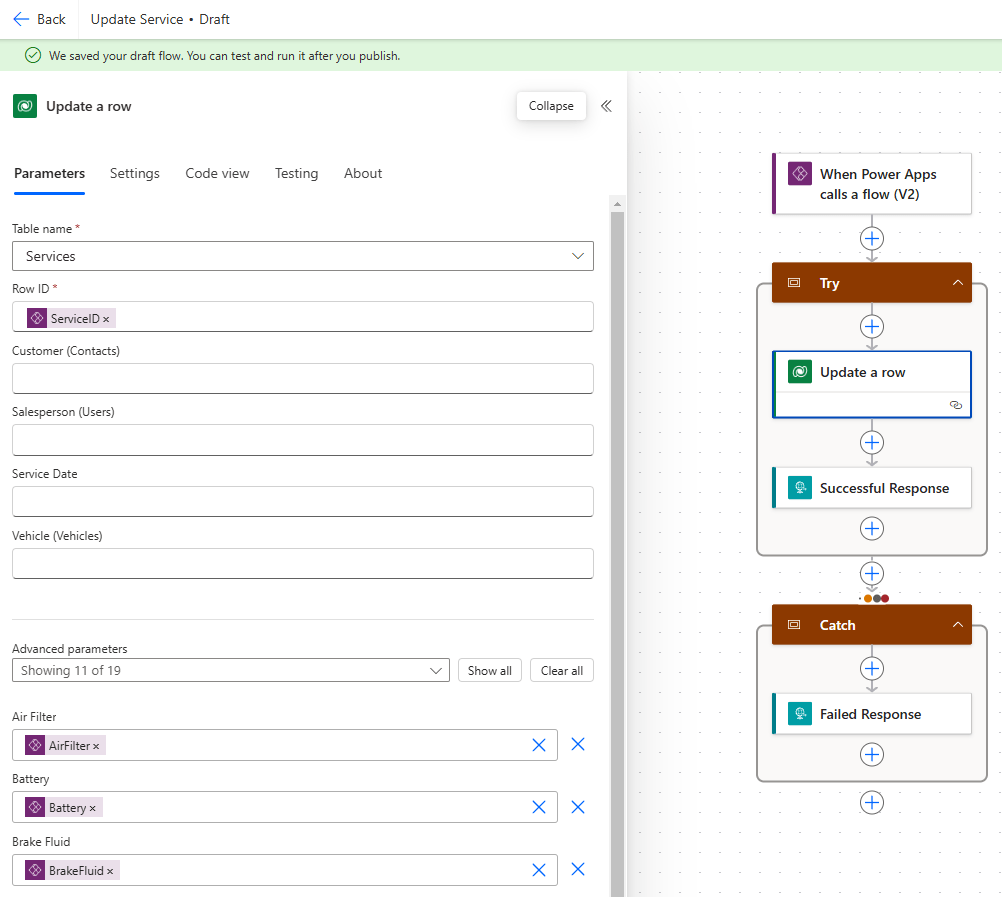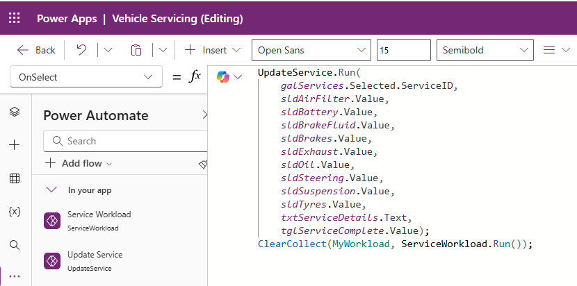 Lastly, we update the OnSelect property of our Save button to run our Update Service flow, passing in the values of our controls: