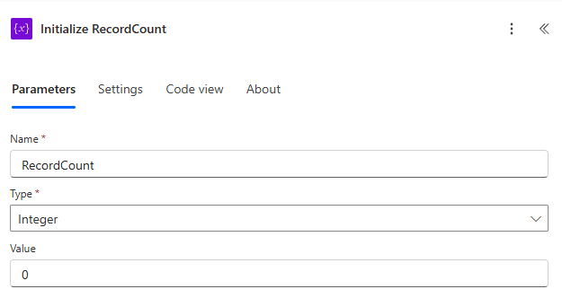 - Action – Initialize variable (renamed as Initialize RecordCount).