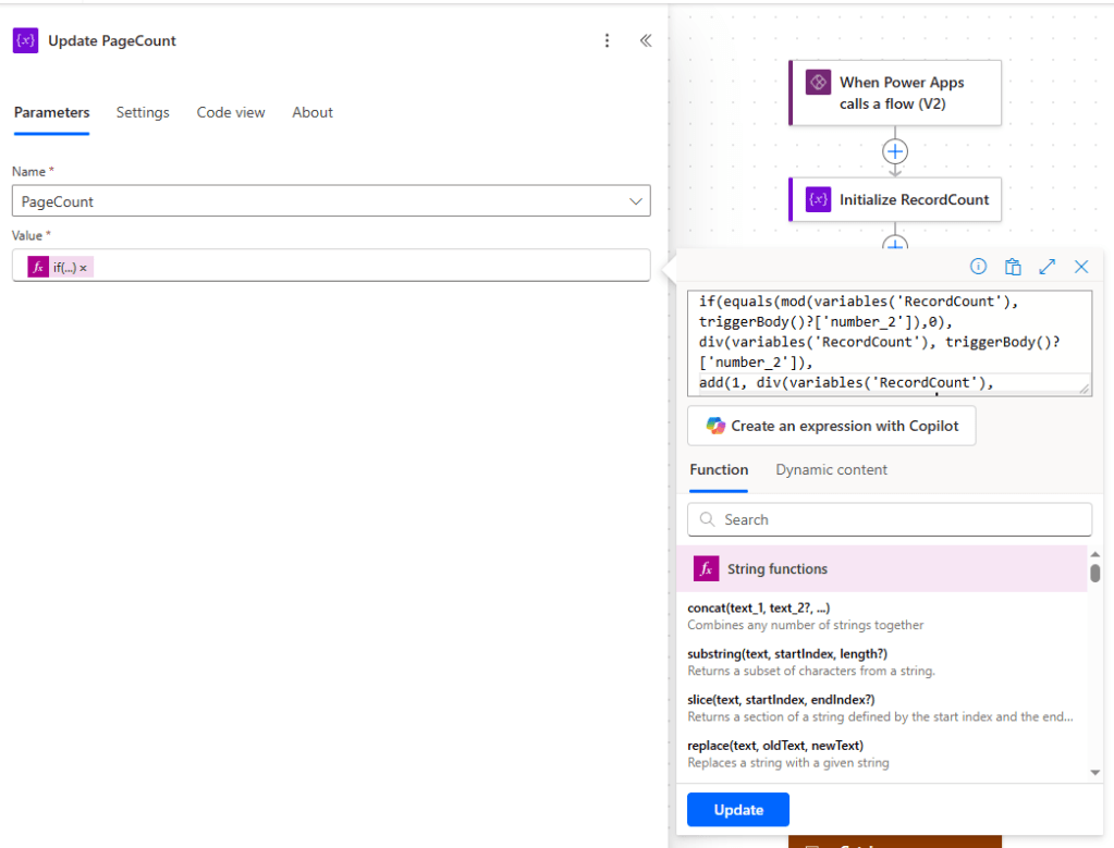 - Value – if(equals(mod(variables(‘RecordCount’), triggerBody()?[‘number_2’]),0),div(variables(‘RecordCount’), triggerBody()?[‘number_2’]),add(1, div(variables(‘RecordCount’), triggerBody()?[‘number_2’])))