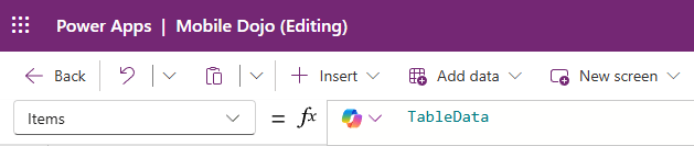 We set the Items property of our Data table to be the result of the Power Automate flow – TableData.