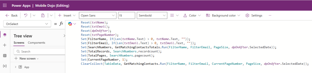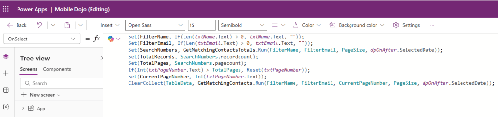 ClearCollect(TableData, GetMatchingContacts.Run(FilterName, FilterEmail, CurrentPageNumber, PageSize, dpOnAfter.SelectedDate));