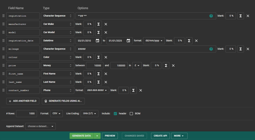 Create an account at Mockaroo – it’s free and a really useful services for developers to create dummy datasets, APIs and databases. Add the following fields: