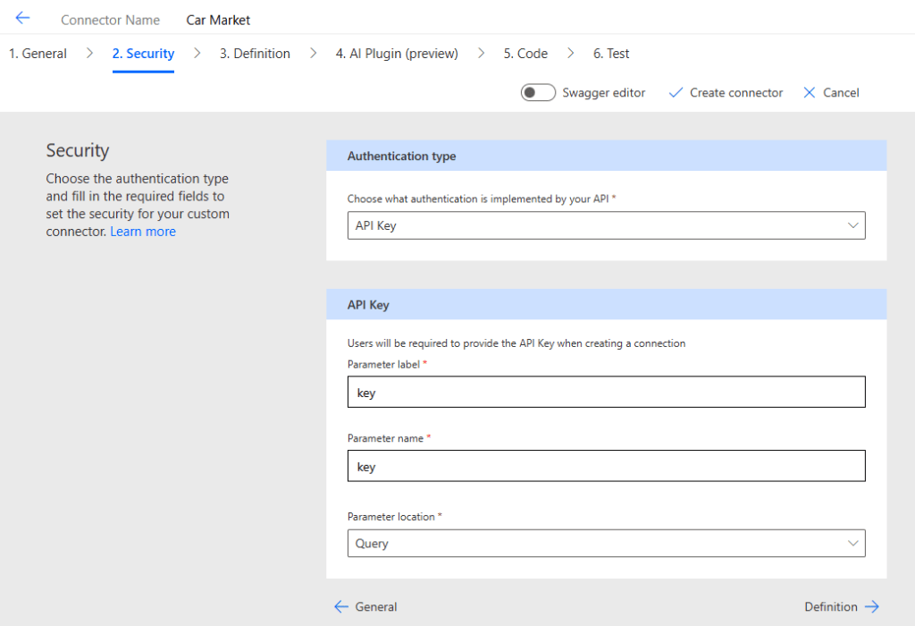 - Parameter label – key – this is a label that appears on the authentication dialog when a flow maker creates a new instance of our connector.