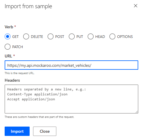 Next, we need to specify what a request to our first API endpoint looks like. Click on the Import from sample link and complete as follows and click Import: