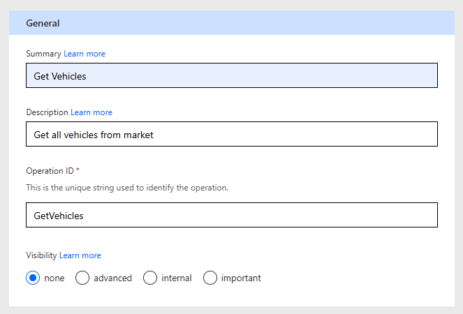 - Summary – Get Vehicles – this appears as an action name in our custom connector.