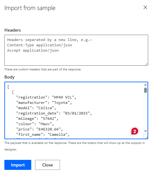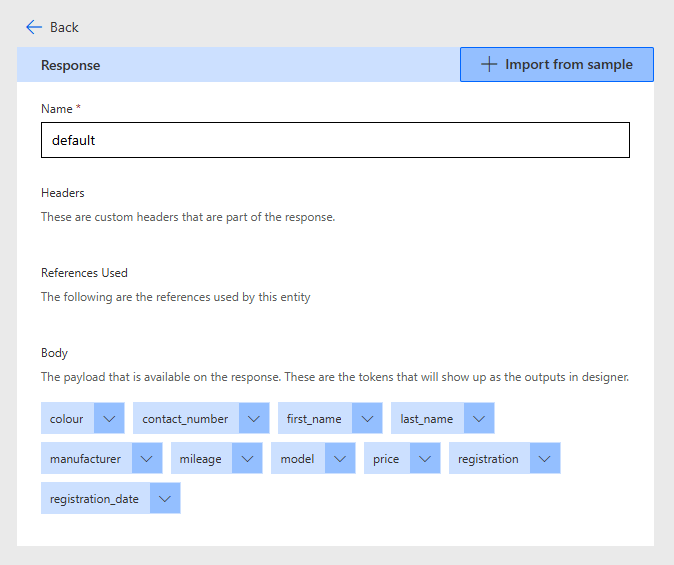 Next we need to specify what a typical response from our API endpoint look like. By specifying the response format, developers using our new custom connector do not have to use the Parse JSON response as we did in the previous post; Power Automate will automatically make these parameters available in subsequent flow actions.