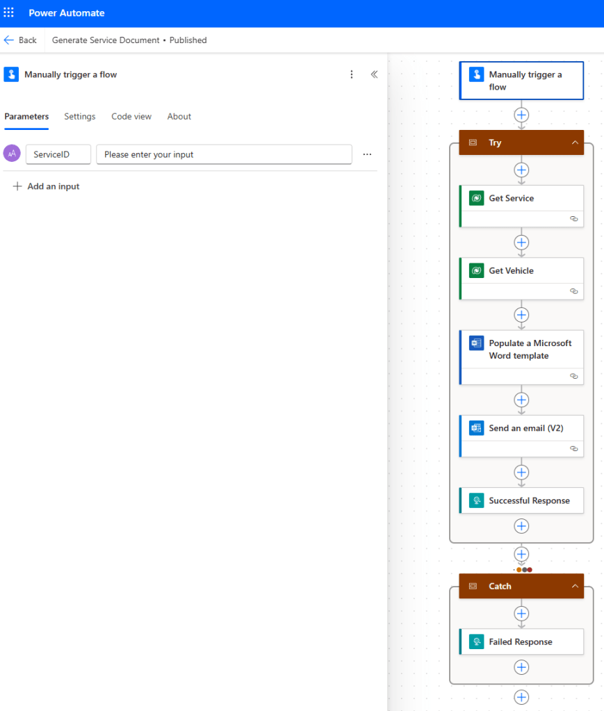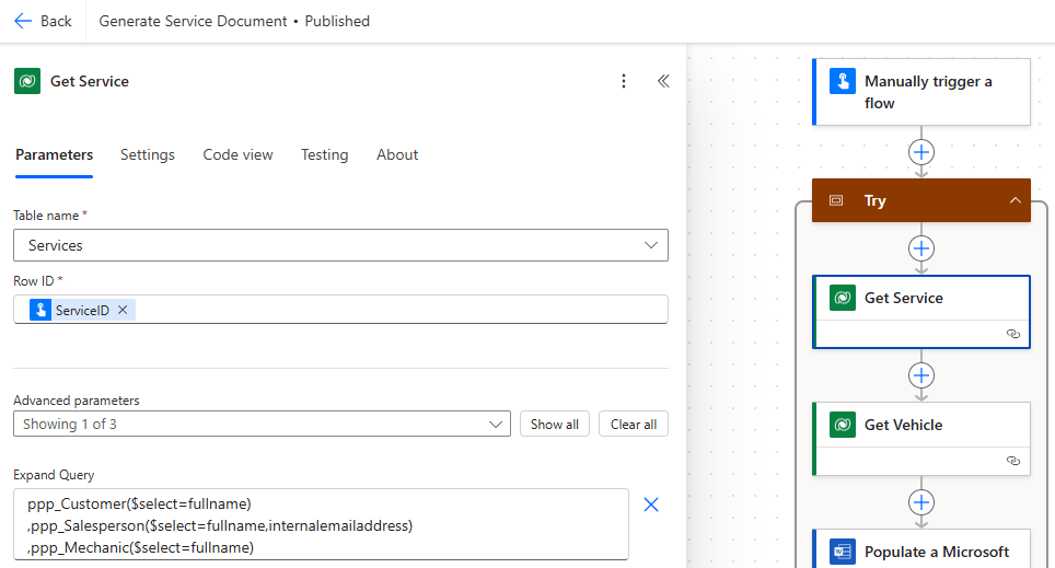 Again, we are using the Scope containers to implement try/catch error handling, as outlined in this post. The first Action of our Try Scope is the Dataverse Action Get a row by ID, which I’ve renamed as Get Service – in this Action, we will fetch the a record from the Service table where the ID of the row matches the ServiceID parameter from our Trigger.