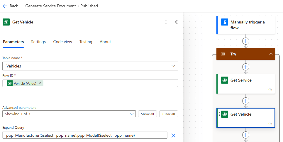 Consequently, we have another Dataverse Action Get a row by ID renamed as Get Vehicle, so that we may fetch the details in that Action: