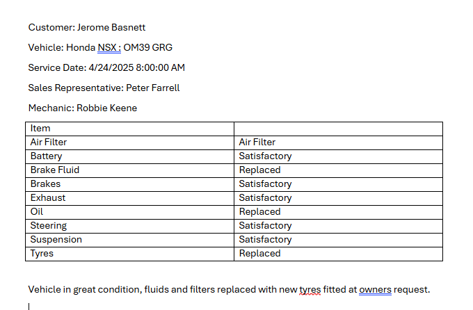 Now when our Mechanic completes a Service, the Salesperson receives an email with an attachment like this: