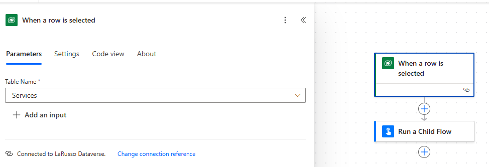 New we create our Request Service Document flow. This is an Instant flow that uses the Dataverse trigger When a row is selected. Set the Table Name to be Services as shown below: