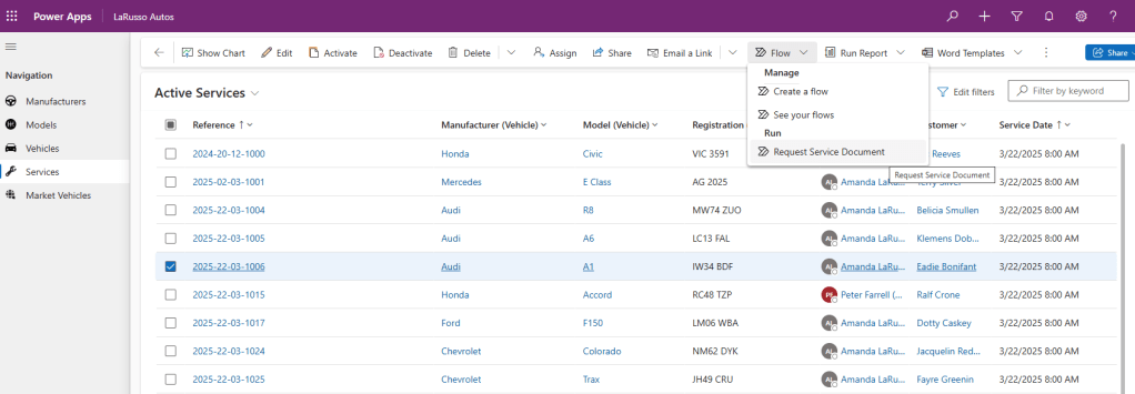 Click Save and Publish. Now when we run our LaRusso Autos app, we can run our Request Service Document flow from any Service Form as shown above, or directly from any Service View: