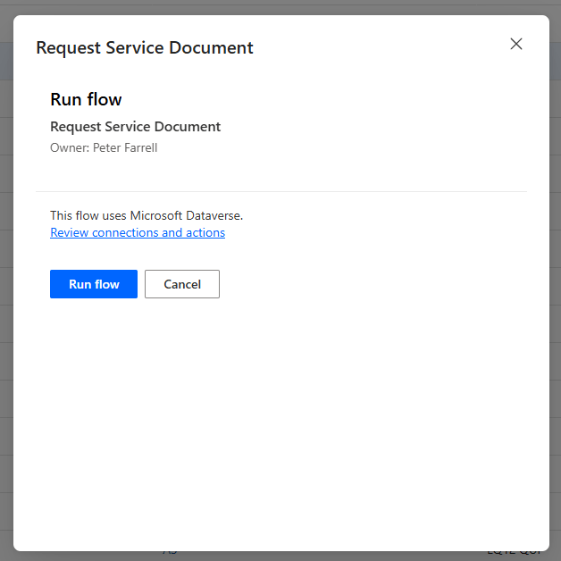 Clicking the flow will launch a flow run dialog – click Run flow to proceed. Admittedly, I don’t think this is a great user experience, but it’s useful to be able to call Instant flows of this kind directly from our model-driven app.